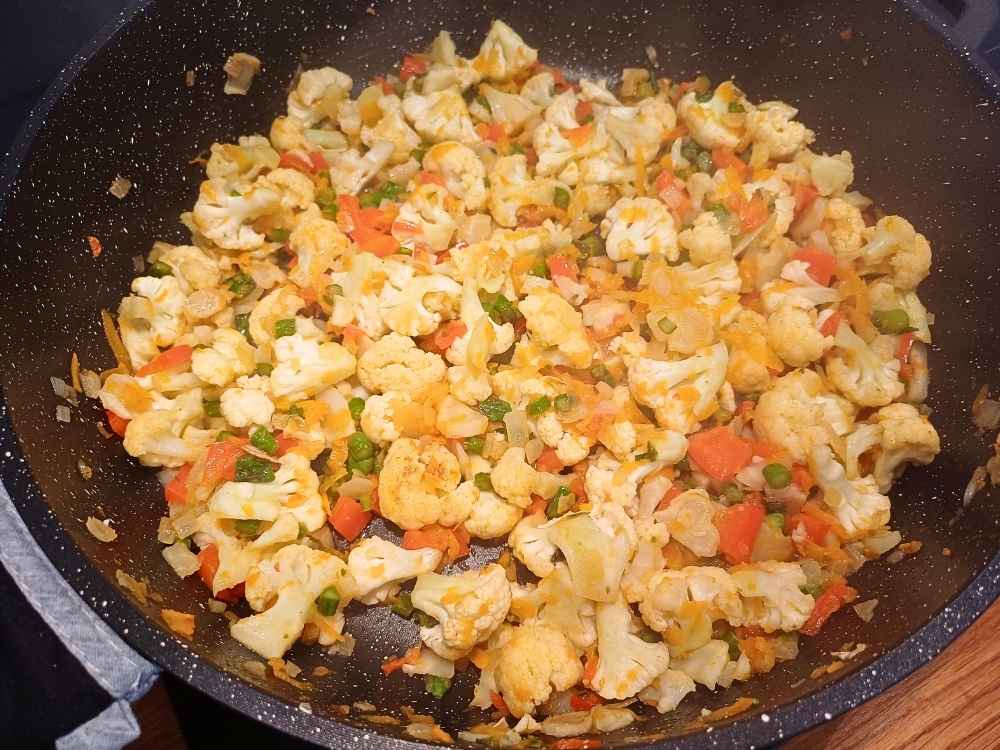 - Chop cauliflower into small florettes and make sure to chop the stems/legs of each florette finely, to avoid large chuncks of cauliflower.