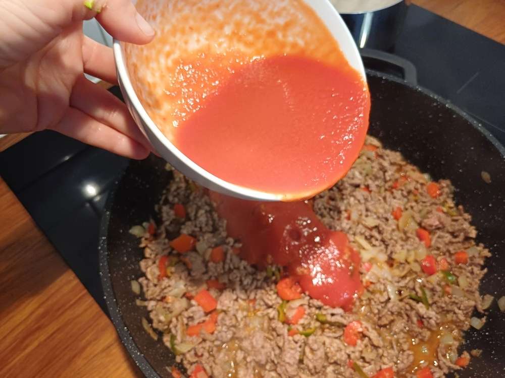 - Add the ground beef to the onions along with red peppers, taco seasoning, pepper, and cook while stirring for another 5-8 minutes until it's cooked though.