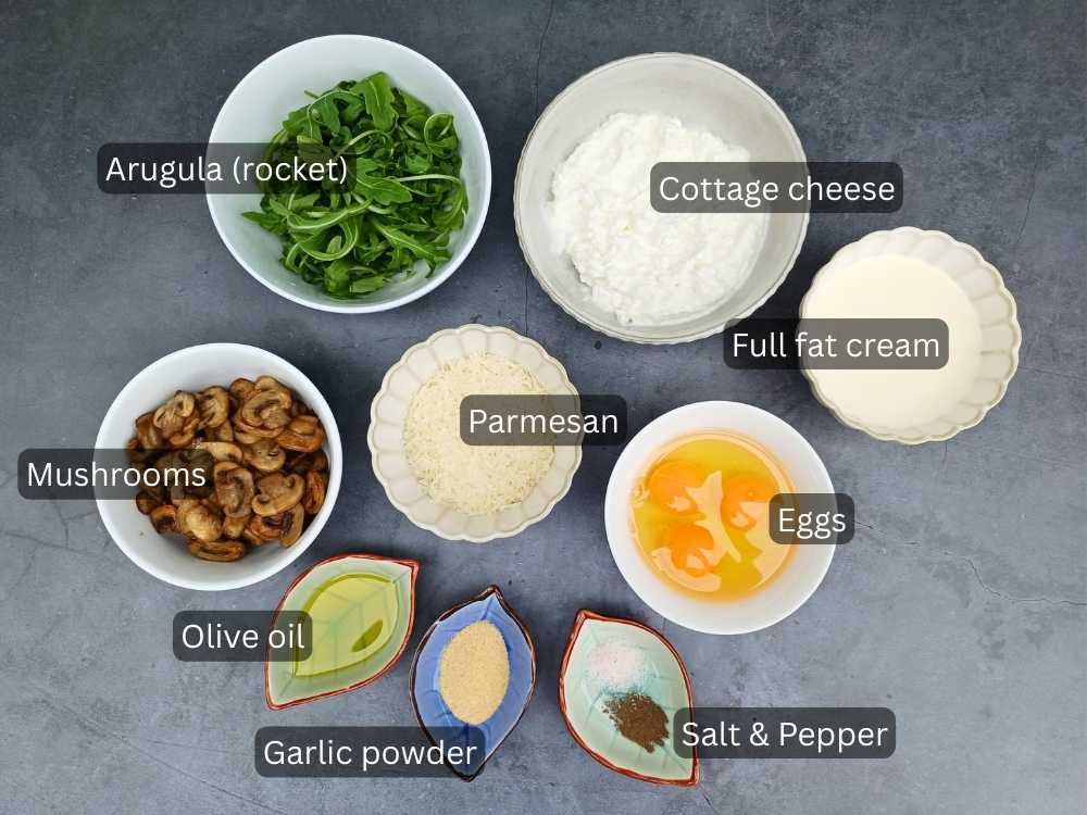This isn’t a traditional quiche loaded with wheat-based pastry and bacon. This is a low-carb almond flour pie crust filled with creamy cottage cheese, whole eggs, sautéed mushrooms, fresh arugula (rocket), parmesan cheese, and feta.