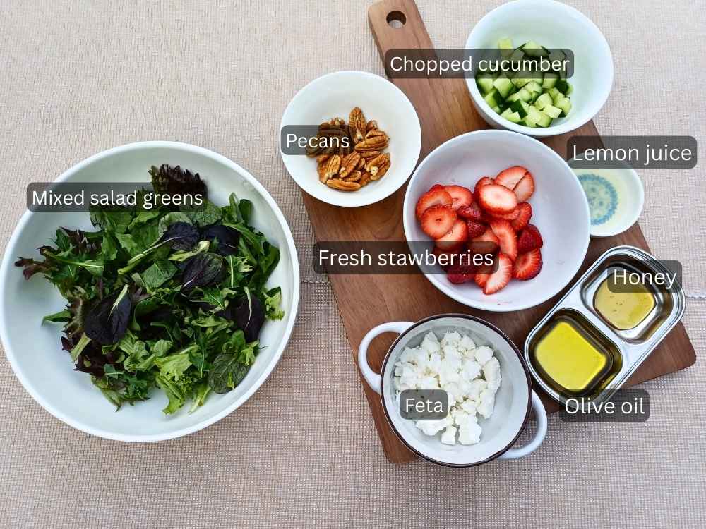 It’s juicy strawberries, tangy feta cheese, crunchy pecans, crisp cucumber, and fresh greens tossed in a simple honey lemon dressing made with olive oil and citrus. Sweet, salty, creamy, and bright in every bite.