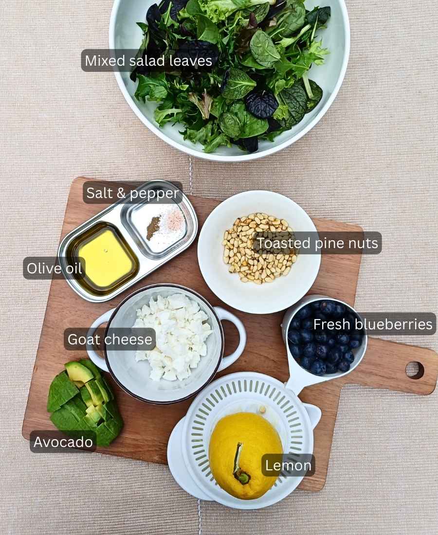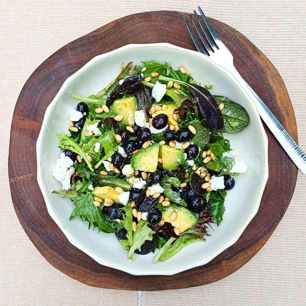 - Scatter blueberries, avocado slices, and toasted pine nuts over the top.