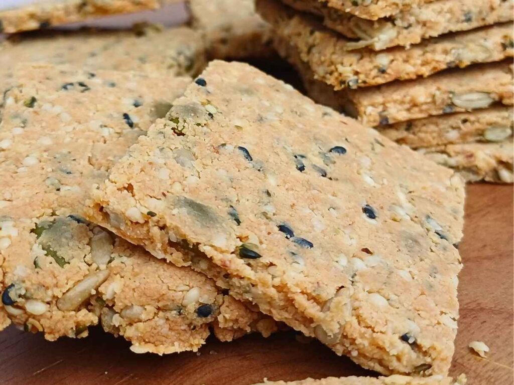 These are made with simple ingredients, packed with seeds, and baked into thin, crunchy squares that feel like a proper snack. The best part is how flexible they are — you can use whatever seeds you have and make your own crackers at home.