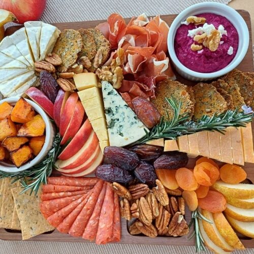 Fill gaps with mini pumpkins, edible flowers, and herb sprigs. Add extra crackers or fruit to balance the board.